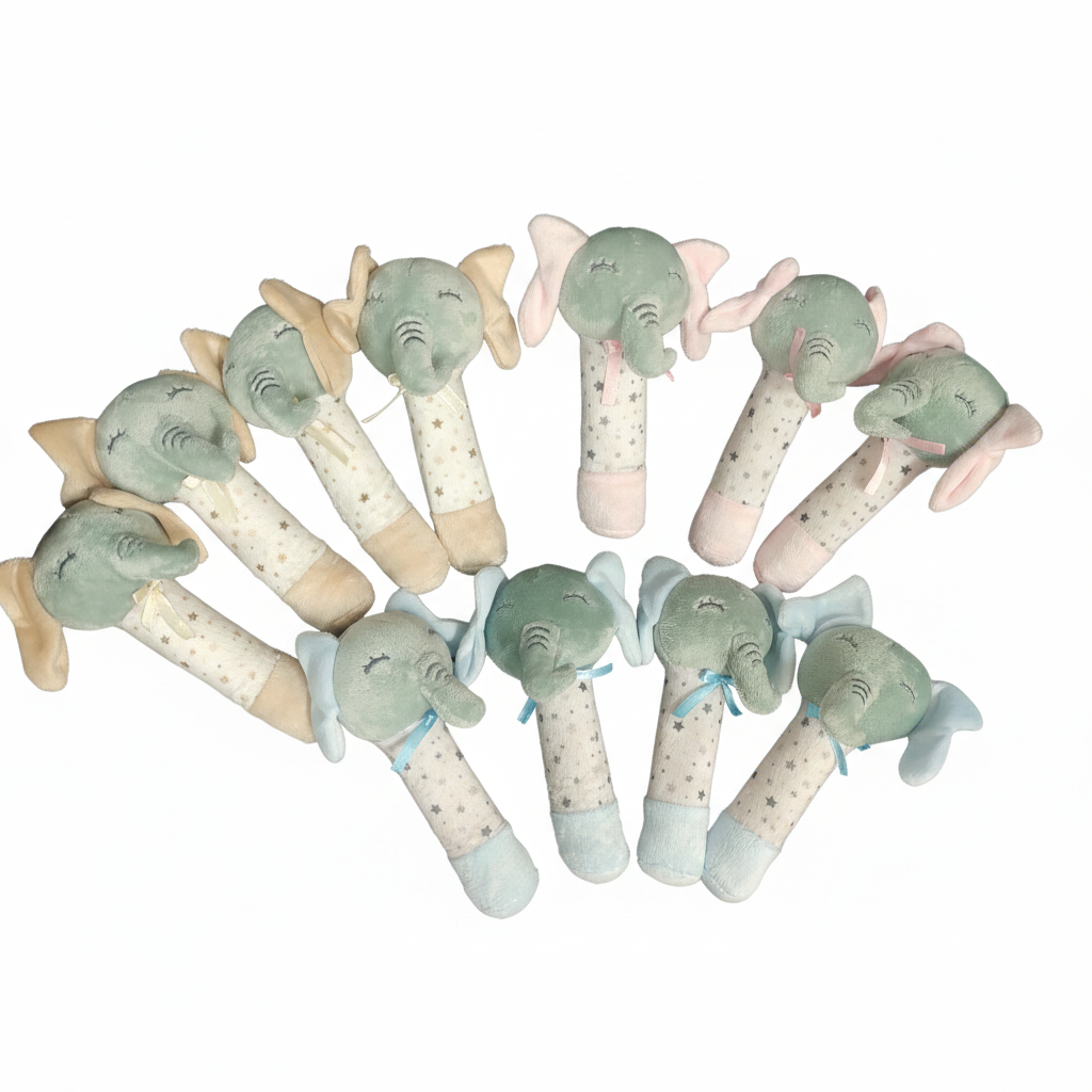 شخصیت فیل با گوشهای رنگی (آبی، صورتی و کرم) به نوزاد کمک میکند تا با دنیای حیوانات آشنا شود. والدین میتوانند با تکان دادن این جغجغه و قصهگویی، قوه تخیل کودک را فعال کنند.