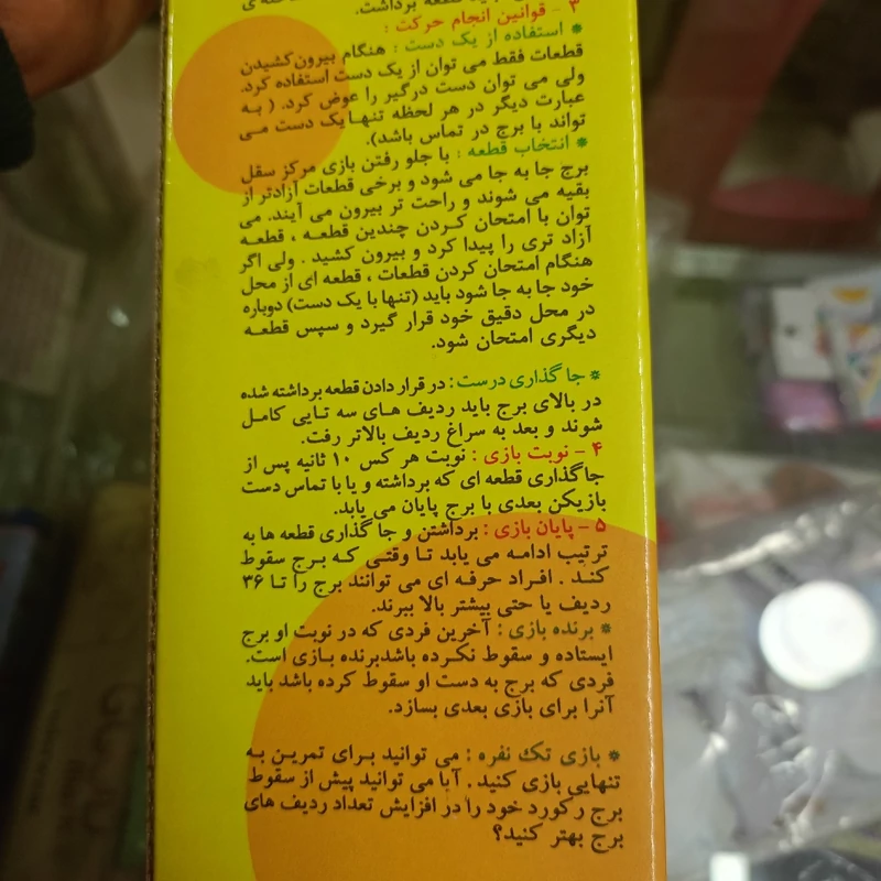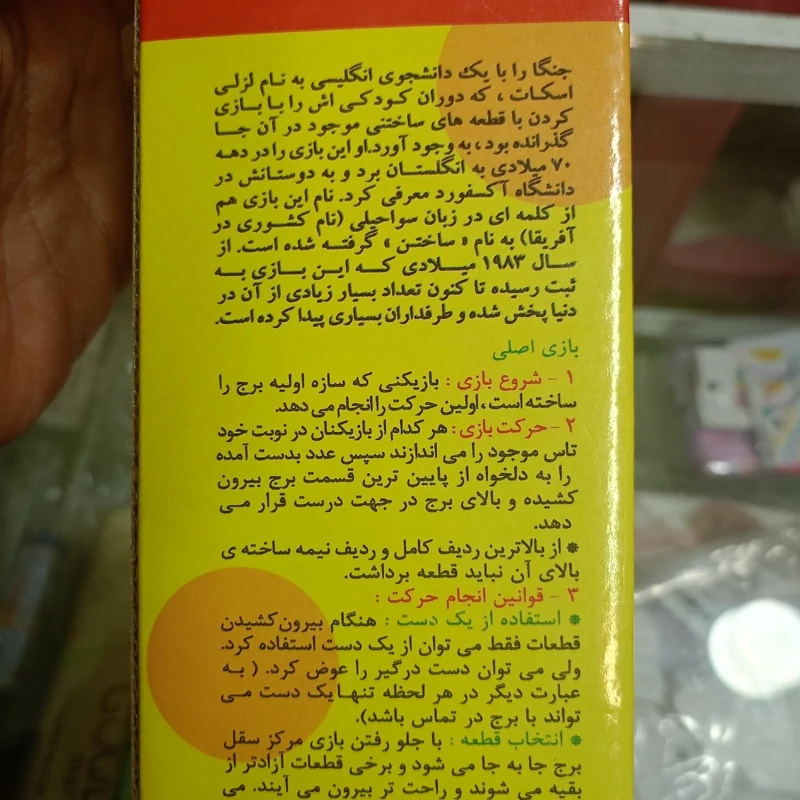 جنگا را یک دانشجوی انگلیسی به نام لزلی اسکات که دوران کودکی اش را با بازی کردن با قطعات ساختنی موجود در آنجا گذرانده بود به وجود آورد. او این بازی را در دهه 70 به انگلستان برد. نام این بازی به معنای ساختن است. از 1983 به بعد این بازی جذاب و سرگرم کننده در سراسر عالم پخش شد و طرفداران بسیاری پیدا کرد. آموزش بازی: بازیکنی که ساخت برج را تکمیل کرده است نفر اولی است که بازی را شروع میکند. هر کدام از بازیکن ها در نوبت خود تاس ریخته و عدد مجموع را از برج خارج کرده در بالای آن قرار میدهند. از بالاترین ردیف نمیتوان قطعه ای برداشت. توضیحات بیشتر در عکس ها موجود است. قبل از ثبت سفارش استعلام موجودی بگیرید. هزینه ارسال بر عهده مشتری میباشد. سوالات شما رو در بخش گفتگو با غرفه دار پاسخگو هستم